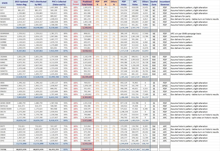 With the 6 week waiting period almost exhausted, it is natural to expect to see a shift in focus from conspiracy theories to election result forecasting on several bases and assumptions. Leveraging data from INEC’s Voter Register per geopolitical zone, assuming historic voting patterns adjusted to reflect current political sway, an average of 65% voter turnout in each State, admitting the influence of incumbent governors on their states, ongoing public response to party campaigns, and intuitive subjectivity, the table below presents an individual forecast of what may be expected. It is by no means the final result and cannot be so interpreted. Rather, it is a prediction anticipating several cross comparisons. This forecast predicts a majority victory for the APC in the presidential elections with 18.4 million over PDP 17.0 million votes.